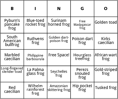 Print amphibians in rainforests bingo cards using the Bingo Card Template now