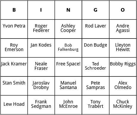This bingo card is about Mens Wimbledon. The words on this Mens Wimbledon 2 bingo card include the names of the Mens Wimbledon winners between 1937-2004. Words on this Mens Wimbledon 2 bingo card include Lleyton Hewitt, Yvon Petra and Stan Smith. You can edit the Mens Wimbledon 2 bingo cards, add more words and generate printable copies of it.