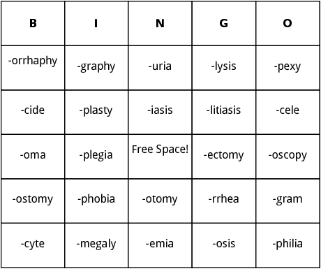 Use these suffixes bingo cards to practice English suffixes like -scope and -uria in class. You can choose either to call out the suffixes from the generated file or print the additional text file below and call out their meaning. For instance, you would call out "fear" and students will need to mark the suffix "-phobia".